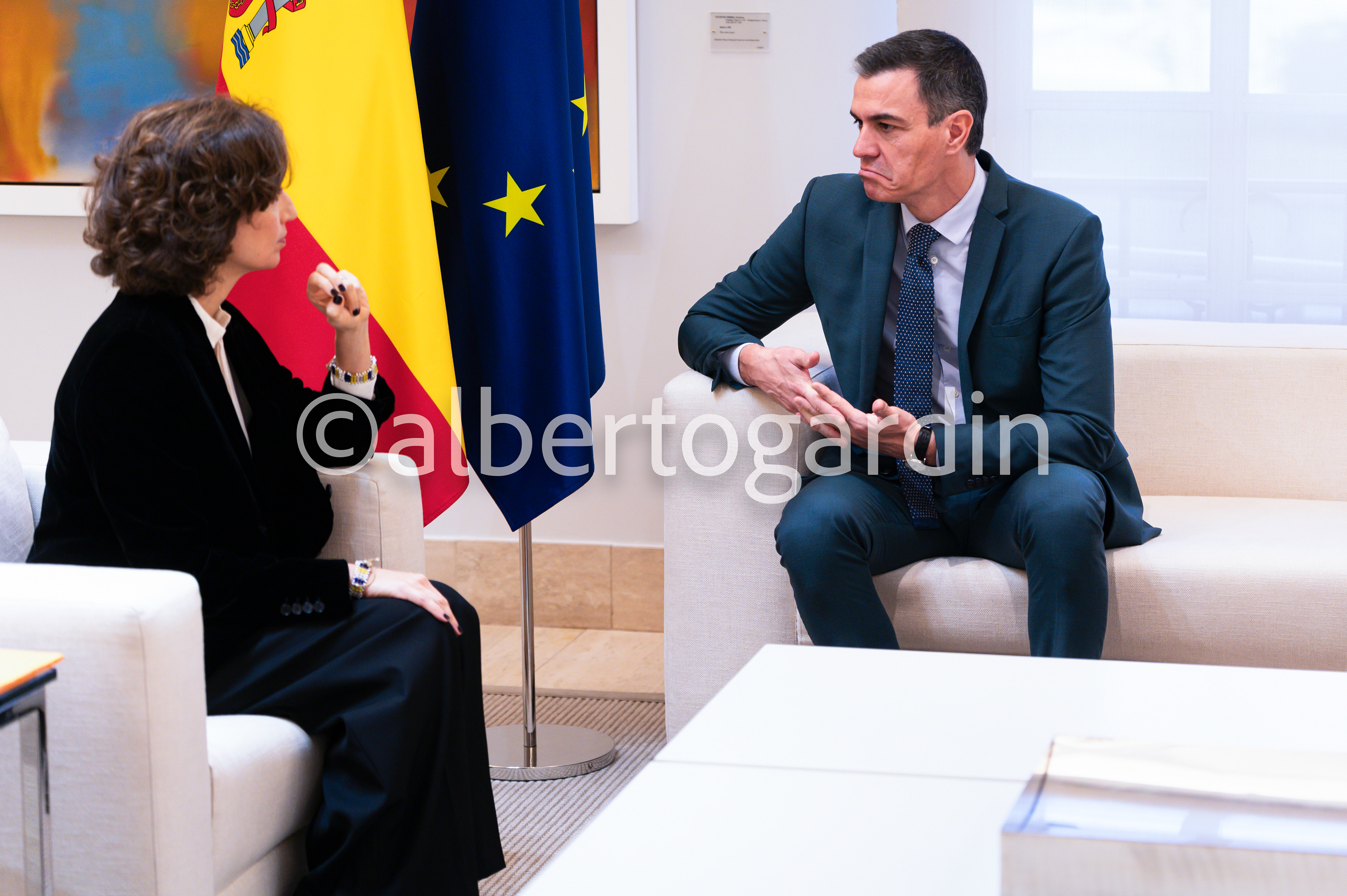 The Spanish prime minister Pedro Sanchez receiving the visit of the Director General of UNESCO Audrey Azoulay in the official headquarters of the Spanish government at Palacio de la Moncloa in Madrid.